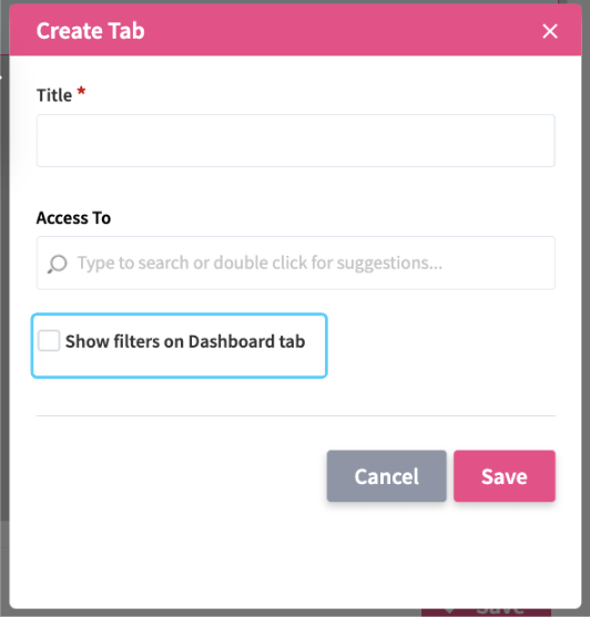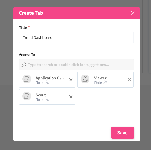 Via the button Add Tab, you can add your own dashboard page. A popup appears where you are asked to add a Title and configure which Users/Groups/Roles have access to this particular custom dashboard. Note that these users will not automatically be granted access to other custom dashboards and/or the global system statistics dashboard.