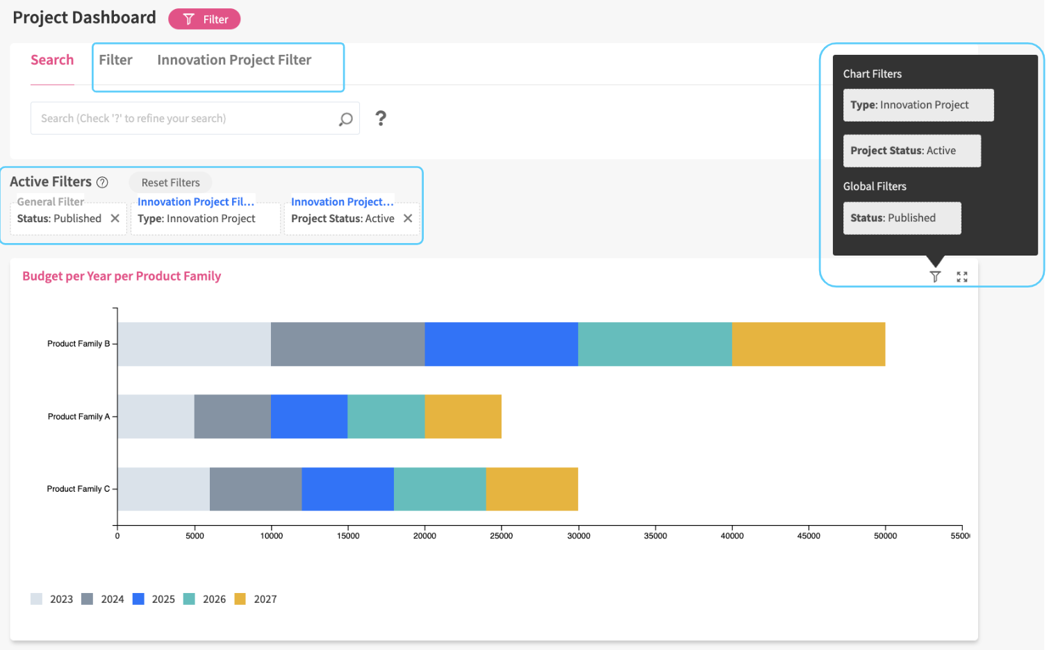 Note: All active filters on an entity filter section (e.g., all Innovation Project filters) and the general filters section are combined to create a chart. Now, one known limitation is that this causes chart-specific filters from other charts belonging to the same entity type to appear in the Global filters section of a chart’s tooltip, even though you did not alter the value of that particular filer’s input field. However, ITONICS aims to rework the underlying filter logic to improve on this limitation.