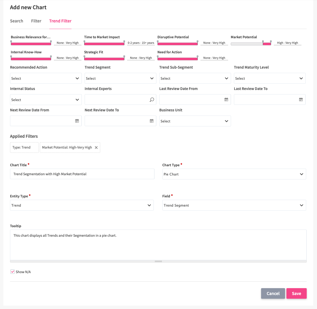 After you've selected your Element Type, a filter section appears on the top. This filter section is similar to the one you can find everywhere else in the system. You can use it to further narrow down the results shown in your chart. E.g. "Market Potential Rating High - Very High "to only show trends based on their segmentation which has a high market potential rating. Note: the filter selected here will be active for the respective chart in the dashboard and indicated within the hoverable tooltip on the chart under “Chart Filters”.