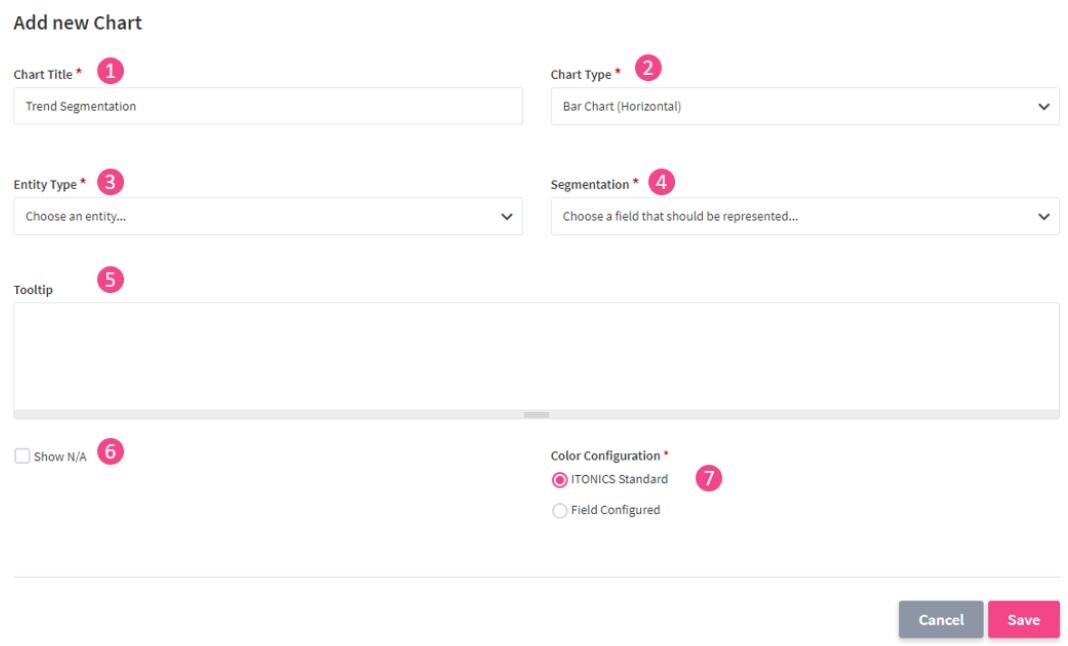 - The Chart Configuration lets you create new charts which can be placed afterward inside the Dashboard pages.