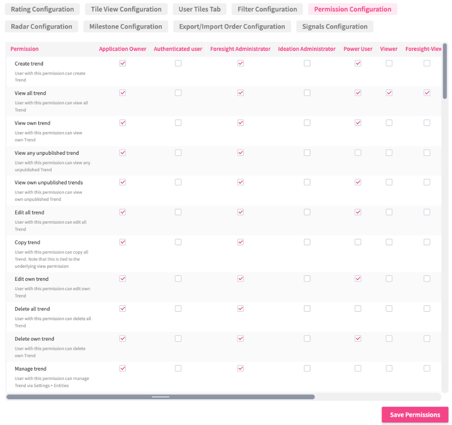 You will now find the permission table of the specific entity, which includes in the columns the roles defined and in the rows the respective permissions. By checking/unchecking the boxes, you change the permission configuration. Hit "save permissions" and the changes will come directly into effect across the whole platform.