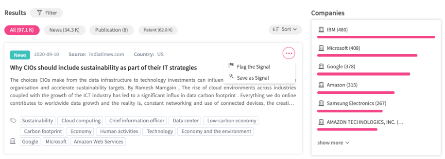 If licensed, the Signals Feed can also display companies that have been mentioned most frequently within the incoming content snippets. This will be shown in a dedicated company widget right to the signals feed. You can use this functionality to identify interesting players, competitors, or potential partners in the market that seem to be investing in a certain technology.