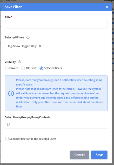 Be aware that when aiming to share a saved filter with selected users within the Signals feed, that all users are listed in the visibility selection. However, the system will automatically validate whether a user does have the required permission to view the underlying element and view the signals tab before sending out the notification. Thus, only permitted users will be notified about the shared filter.