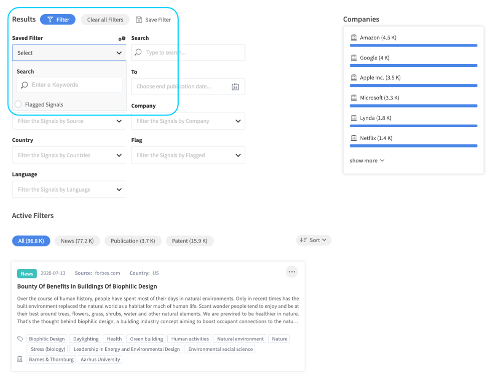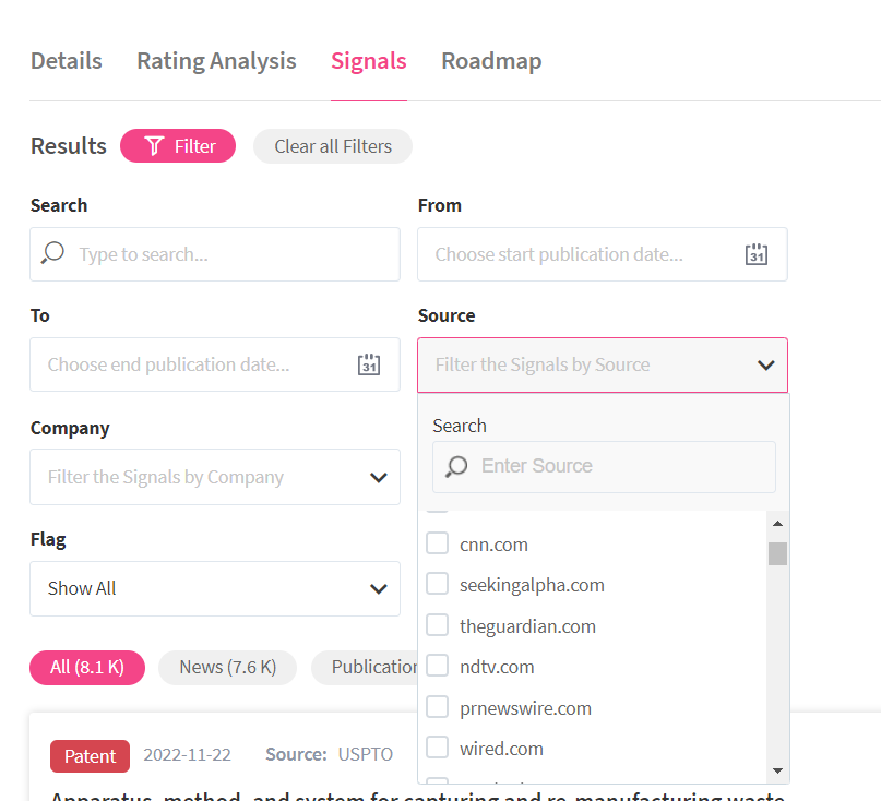 In the Signals feed, we display patents, scientific publications, and news from a multitude of sources.