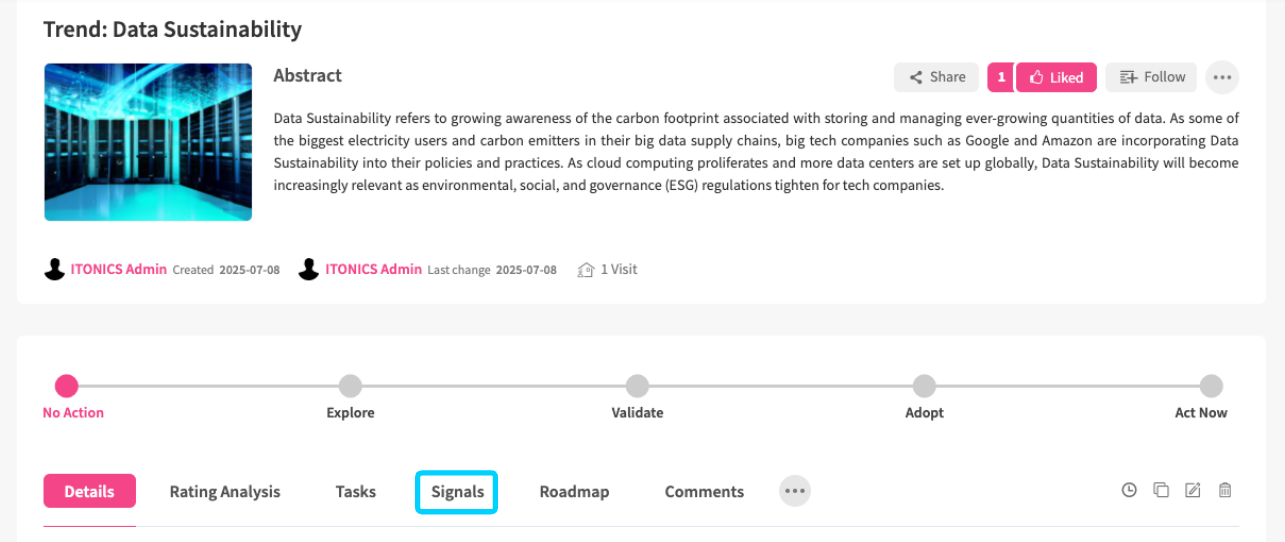 If the content from the signals feed should be saved in another content category, please get in touch with your Application Owner who will reach out to an ITONICS Customer Innovation Success Manager.