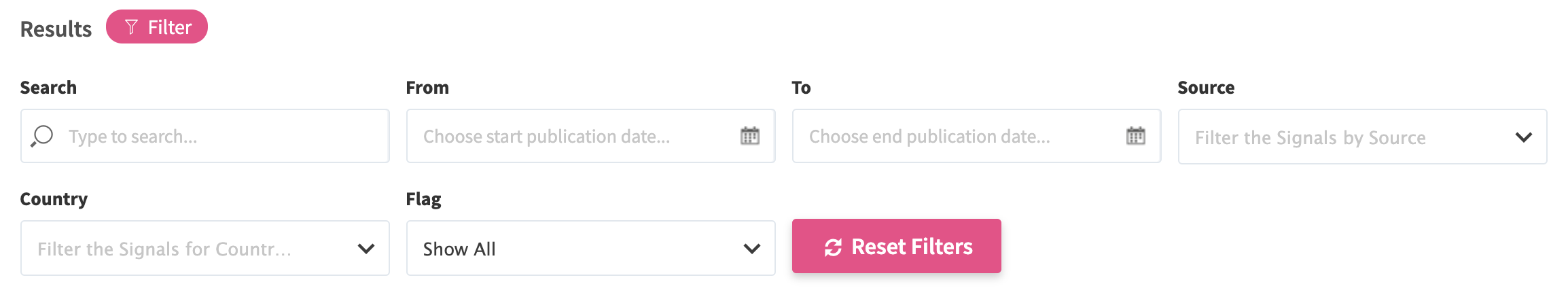 Select dates (From and To) to focus on the Signals that were published during a specific time (for example, you can choose those that were published just this month)