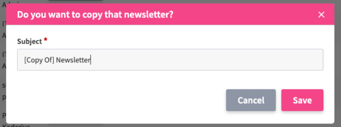 Clicking on the action button will open a new popup window prompting the user to provide a new Subject for the copied newsletter. By clicking the Save button, the copy of the existing newsletter will be created and will be listed accordingly on the newsletter overview table. The newly created copy will have all the content of the original newsletter, while the content can still be adjusted using the Edit functionality.