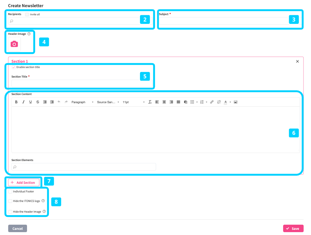 Upload a Header-Image which will appear at the top of your newsletter (4). If required, it can be disabled as well (8).