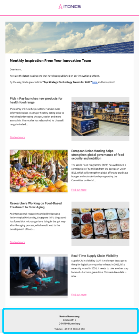Further, you can determine if the ITONICS logo and the added Header-Image are supposed to be shown on the Newsletter page. (8)