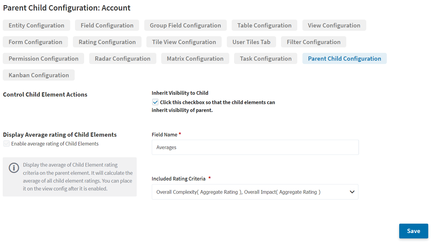 Here, you can select which entity (from the list of available entities) should become the child element. Once set, a new configuration tab will appear called 'parent child configuration'. Via this tab, you can now check the box to inherit the visibility of the parent to the children.