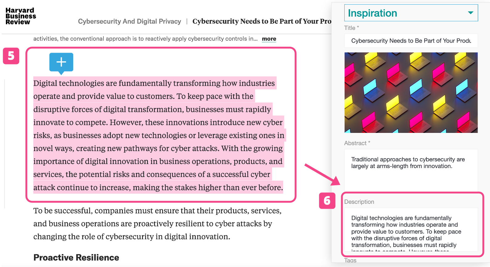 You can also clip other text from the article by selecting the text inside the web page with opened web clipper [5]. A plus icon appears which lets you easily copy text into the Description field of the Web Clipper. [6]. It should be noted that the Description field may be named differently in your system if you have made changes to it.