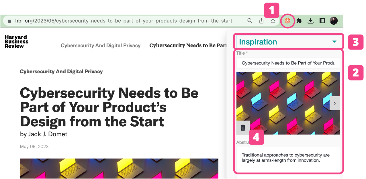 Imagine you are browsing the web, and you find an interesting article that you want to share with the other users of your ITONICS application. While visiting the web page, click on the browser add-on symbol for the ITONICS Web Clipper to open it [1].