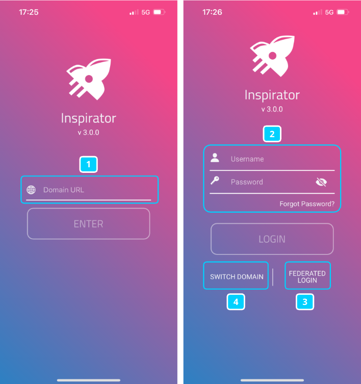 - In case you need to change the system for which you want to access the Inspirator app, click switch domain (4) to go back one step to (1).