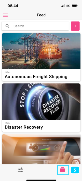 After your successful login, you will land in the Feed, showing the most recent content that has been added to your application (5).