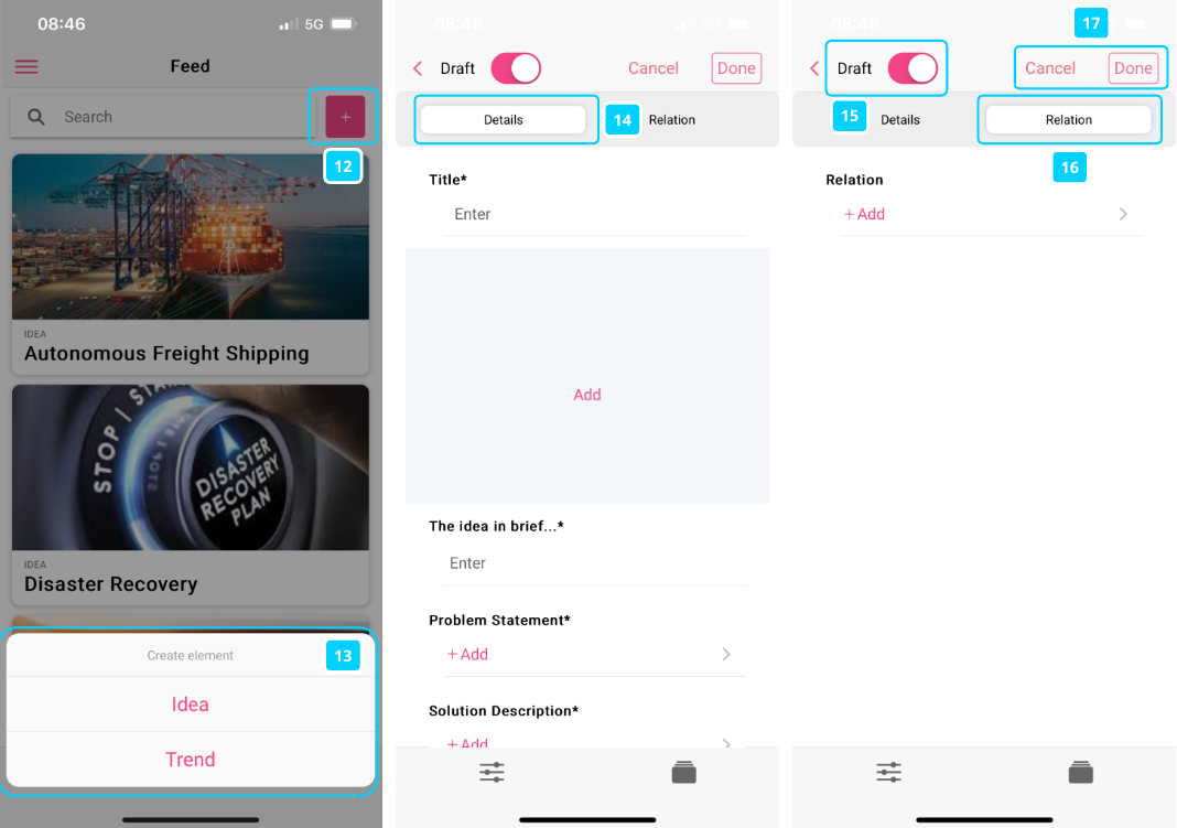 To create an element, click on the + icon in the top right (12). This will open a popup modal (13), allowing you to select and create an element for any of the entity types configured for the Inspirator app (and tied to your system access permissions, i.e. create trend permission). After having selected an entity type, you are redirected to the create form. At the top, the configured tabs are shown, per default you are navigated to the Details tab (14). Similarly to the element creation in the ITONICS system, you are required to at least enter values for configured mandatory fields, i.e. Title, Abstract. If you want to relate the element to an existing element, navigate to the Relation tab (16). Here, you will also find the option to link a (mandatory) parent entity/element in line with the behavior in the create/edit form in the system to define a parent relation in the case that the underlying element is of a child entity type. Once finished, you can toggle the Draft option to create the element as a Draft, or not to publish it right away (15). To confirm the creation of the element, click Done, Cancel to abort (17).