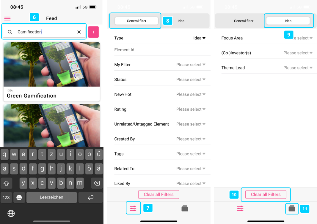 From here, you can scroll through existing content and explore specific elements. Click into the global Search bar to search for particular content (6). Clicking on the Filter tab (7), you are redirected to the General filter section (8). Similarly as in the underlying ITONICS system, you can filter for general filters, such as the Type filter to narrow down the elements for specific entity types only, or navigate to the entity type-specific filter sections (9) to apply filters only for a particular entity. Click on the Clear all Filters button to remove the filter selection again (10). Once the filter selection is done, you can navigate back to the Feed page via the bottom right tab (11).