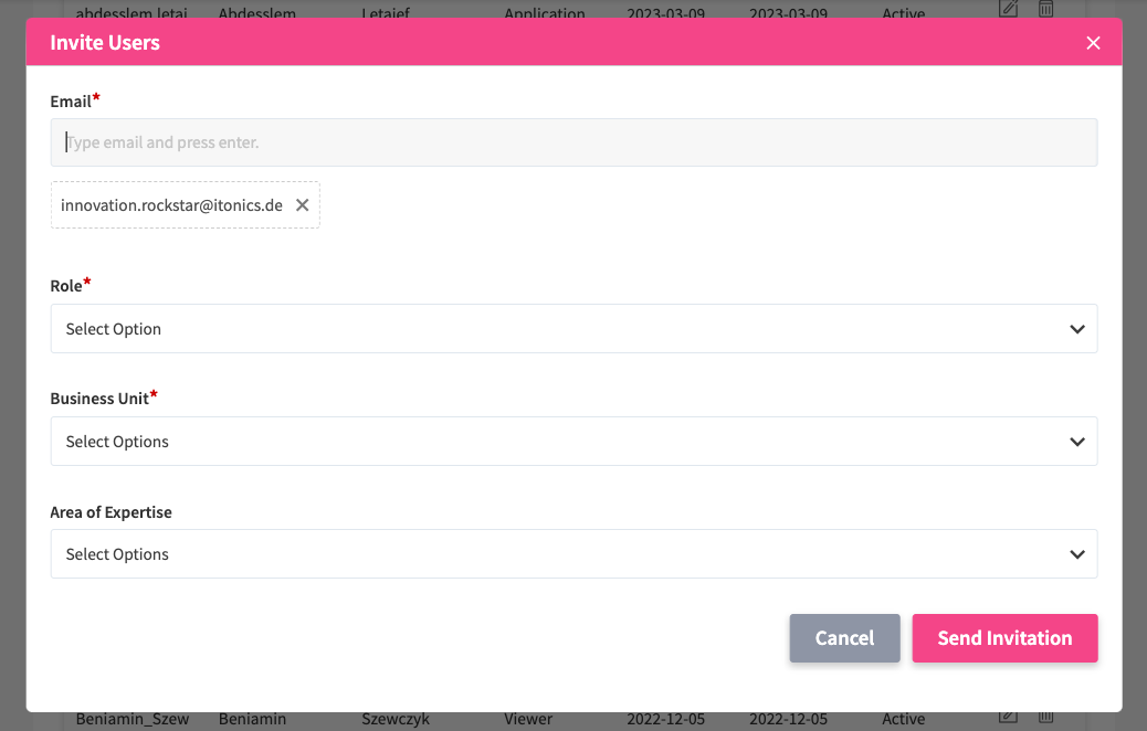 Please note: Hit the ENTER key once you added the email address. Only then the email address is being selected. You can also add multiple email addresses to bulk invite more colleagues at once. For changing the business unit options, please get in contact with your Customer Innovation Success Manager.