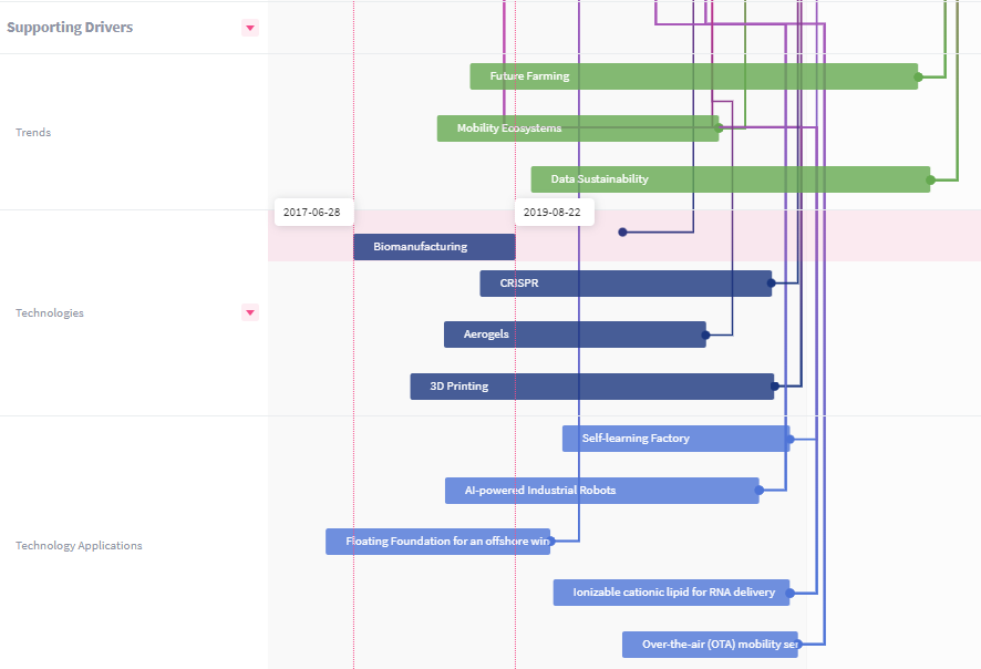 We have implemented a new functionality which allows for vertical sorting within the ITONICS Roadmap. Use simple drag and drop to move elements on the Roadmap to adjust positions and dates of elements within and across Roadmap layers. The new functionality allows for a more easily configurable Roadmap view.