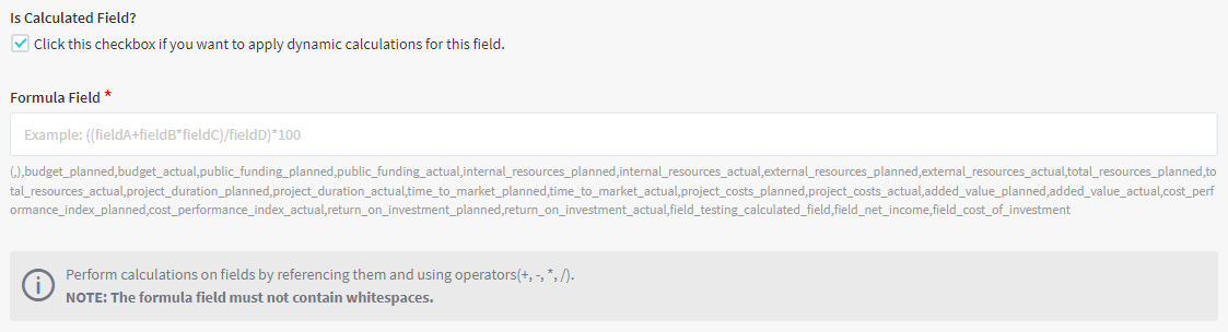 We have implemented a new functionality which allows for dynamic calculations of existing numeric inputs. You can use existing numeric fields to perform addition, subtraction, multiplication, and division calculations. Calculated number fields can, for example, be useful to flexibly and dynamically calculate total project costs and ROI, do KPI aggregations on the Board, or use the calculated fields within the Matrix visualization.