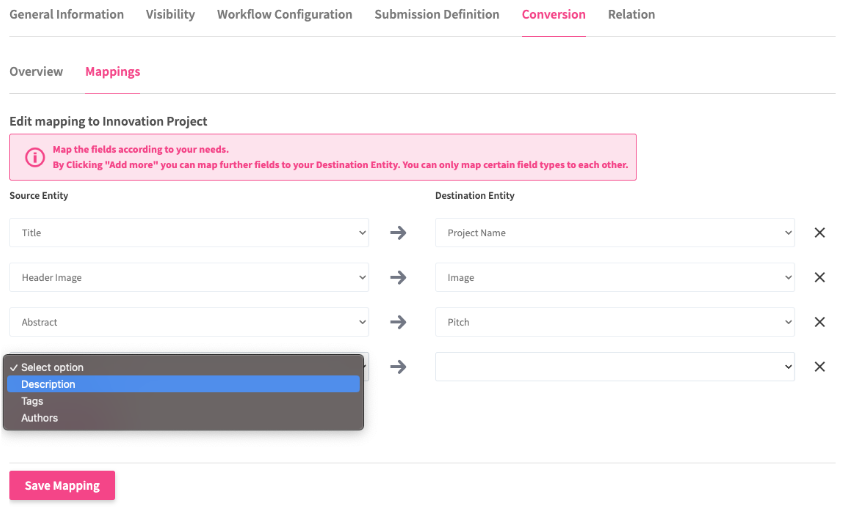 We have implemented the convert functionality for the campaigns module. Now, it is possible to easily allow the conversion of sound submissions / ideas into elements of another entity type, such as innovation project, by allowing to configure a mapping between the submission and a destination entity type in the campaign setup. Thus, this functionality allows you to seamlessly transition from “How to Win” to “What to Execute”.