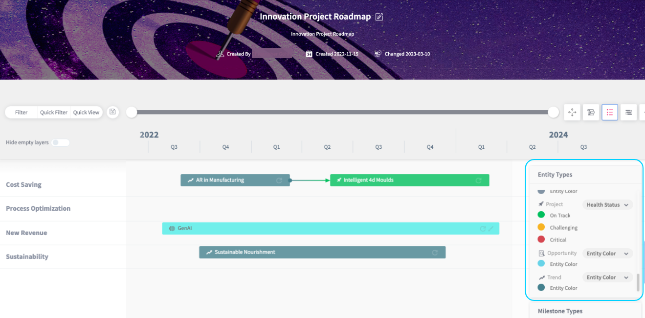 We have improved the capabilities of the roadmap module. Instead of the color of elements being predefined from the EC, we now have made the color dimension configurable to allow the flexibility of adjusting the color of elements on your roadmap according to your needs. You may either provide a default color schema per roadmap per entity type to ensure consistency and clarity in your visualization, or even define a color on an individual roadmap element. Additionally, make use of the color configuration of list fields available for an entity type, while always being able to dynamically assess elements based on other field colors via the updated roadmap legend. This configuration empowers you to tailor your roadmap visuals to better convey information and insights to your stakeholders, ultimately utilizing the color as a more meaningful information dimension on the roadmap.