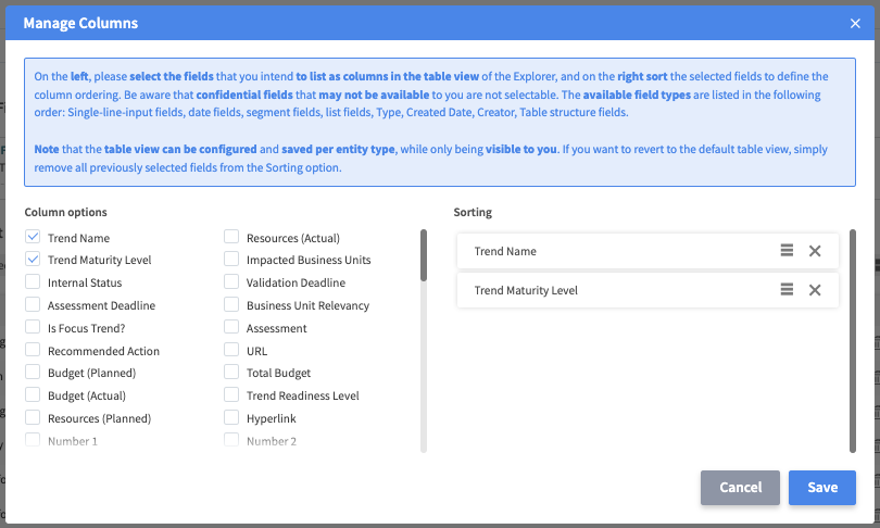 We have implemented a new functionality available within the Explorer module. Now, if applicable, a new configuration option Manage Columns will be available within the Explorer allowing you to configure your own list view per entity type dynamically. Easily configure which fields, respectively columns shall be displayed in the table view allowing the provision of a more tailored view of the elements of an entity type that best suits your needs. This empowers you to organize and prioritize information more efficiently.