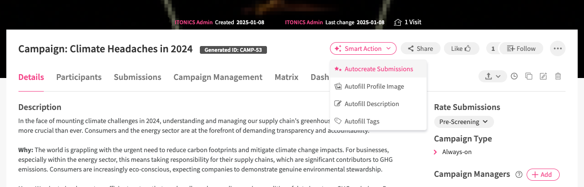 We have introduced Smart Actions , a new AI-powered feature designed to streamline content creation. With Smart Actions, you can effortlessly Autofill based on an element’s title and abstract, ensuring relevant and compelling content. Additionally, the Autocreate leverages this capability to generate entire elements, such as ideas in ideation campaigns, accelerating your creative workflows. This innovative feature helps you save time, maintain consistency, and enhance productivity across your innovation efforts.