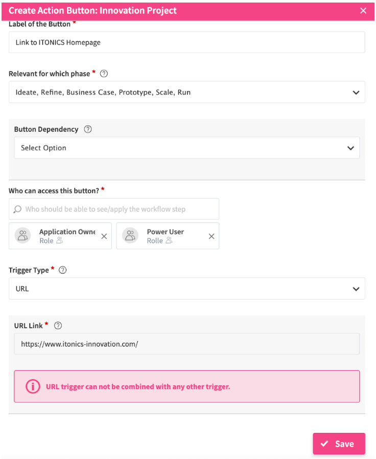 Trigger Types describe the action that will be performed by the system after a user clicks on an action button. We have implemented the URL trigger, which you can now use to link to any external or internal website. This trigger enables you to link, for example, to a SharePoint site, blogs, a specific Knowledge Base article or within the ITONICS Innovation OS to a specific site, e.g., to a custom tab with KPIs, or the Radar.