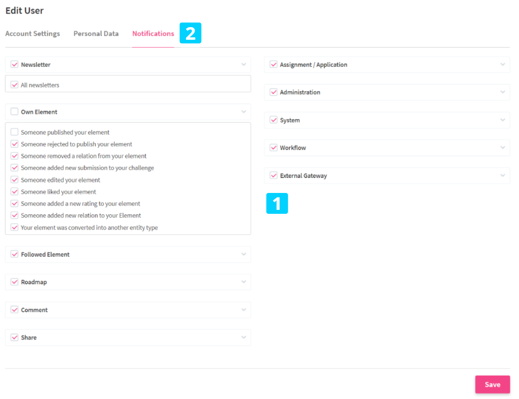 We have redesigned the way Notifications are displayed within the ITONICS Innovation OS. Now, Notifications are grouped according to their respective Notification Category (1). This allows you to easily and more intuitively select which Notifications you want to receive by email via the Notifications Settings in your user profile (2).