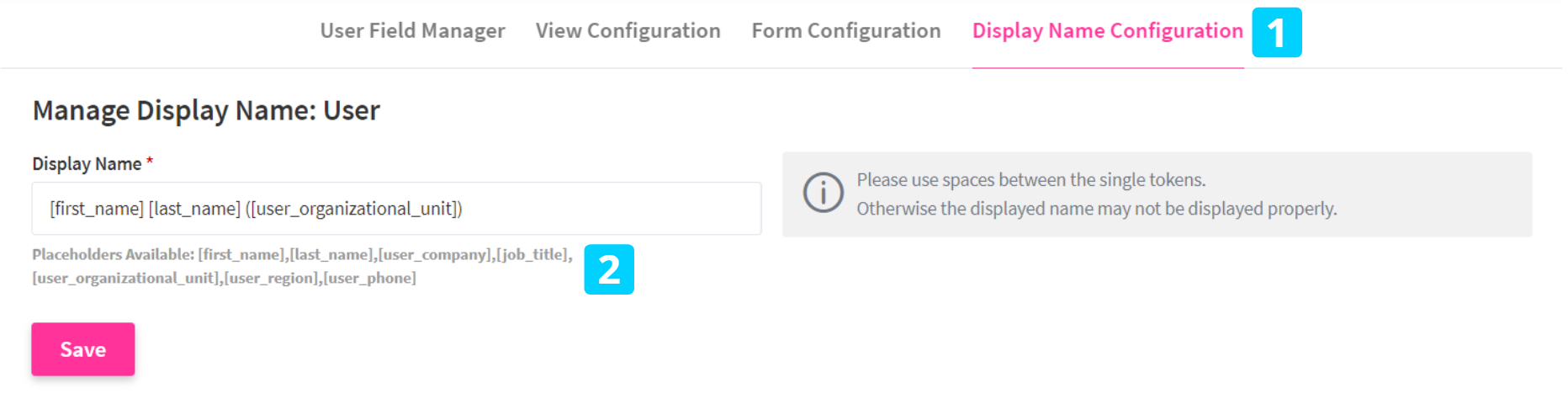 In large organizations, there can be several users with the same name. This makes it difficult to differentiate them quickly on the system, specifically when searching for users. To solve this, ITONICS now offers a Display Name Configuration (1) where you can differentiate the users based on User Attributes like Organizational Unit, Region, etc. By making use of the available tokens (2), you are now able to individually configure the display name.