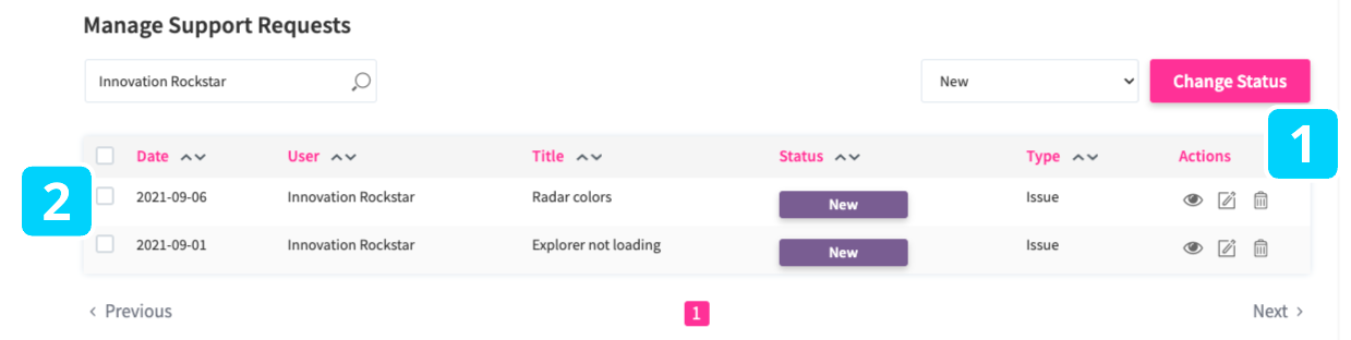- You can Select multiple feedbacks in the checkbox on the left of each row and bulk-change their status that can be chosen in the dropdown field next to the Change Button on the upper right side. Click on the Change Status button to apply the changes (2).