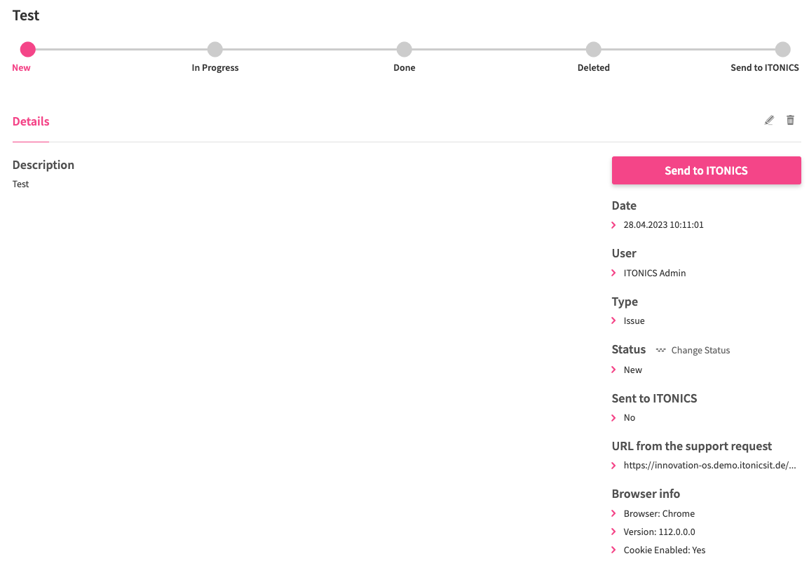 - To send an Issue/Bug to ITONICS, click on the title of the feedback. You will land on the detail page of the feedback where you can find the button "Send to ITONICS".