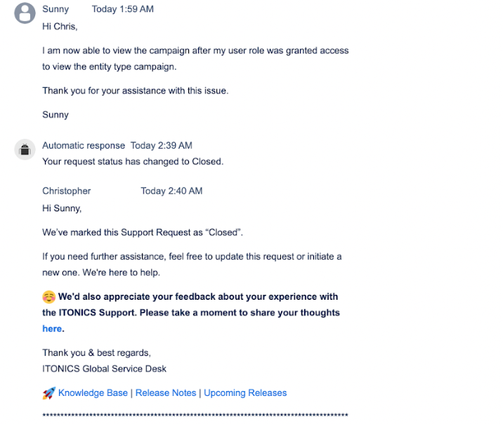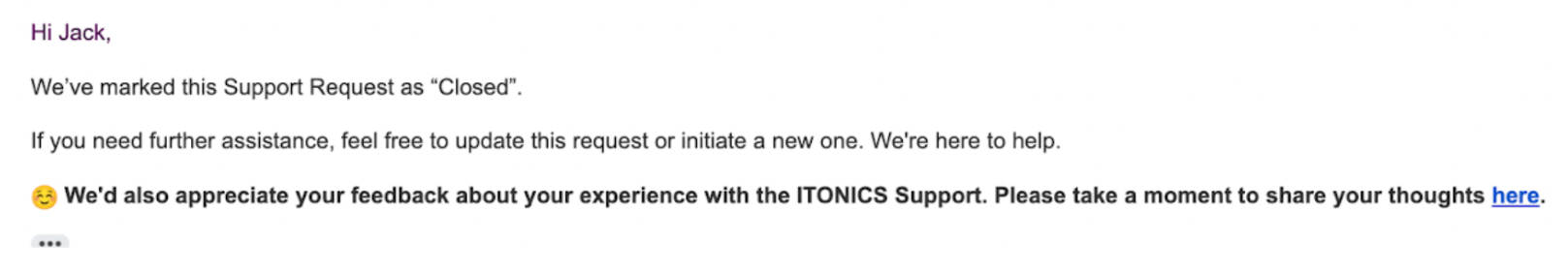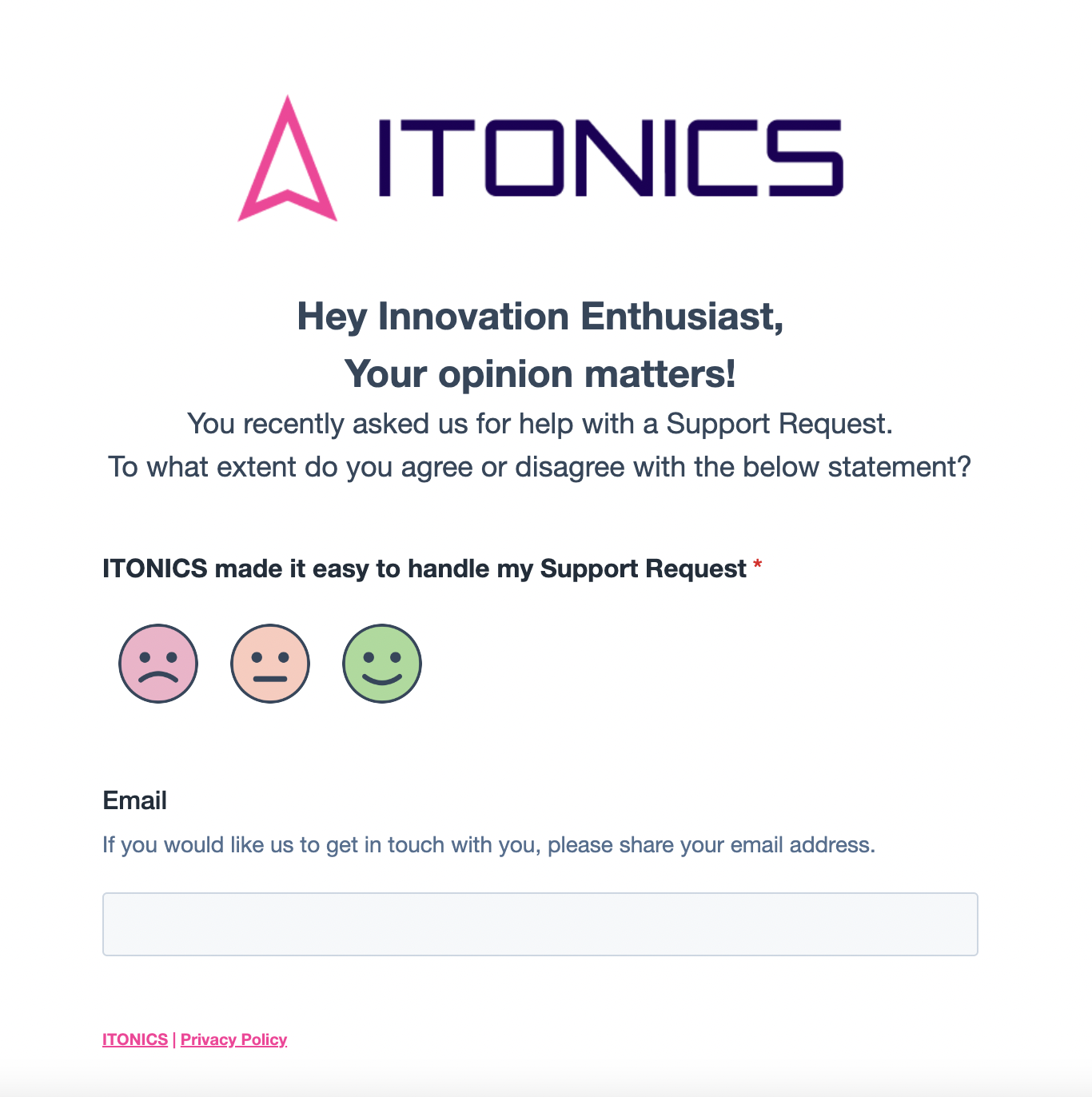 As ITONICS always strives to maintain high standards and continuously improve their customer support, you will receive the below request to provide feedback on your Support Experience once you have confirmed that your incident reported has been fixed.