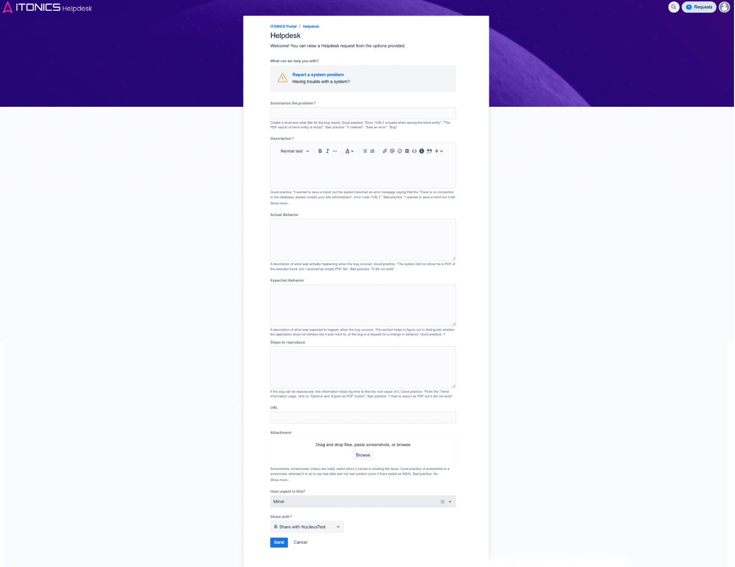 To report an issue or bug to ITONICS you must first log in to the HelpDesk Portal.