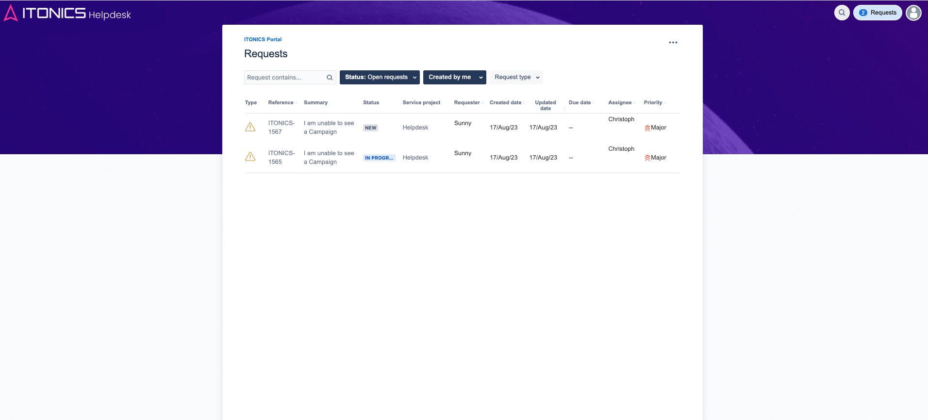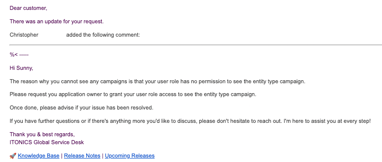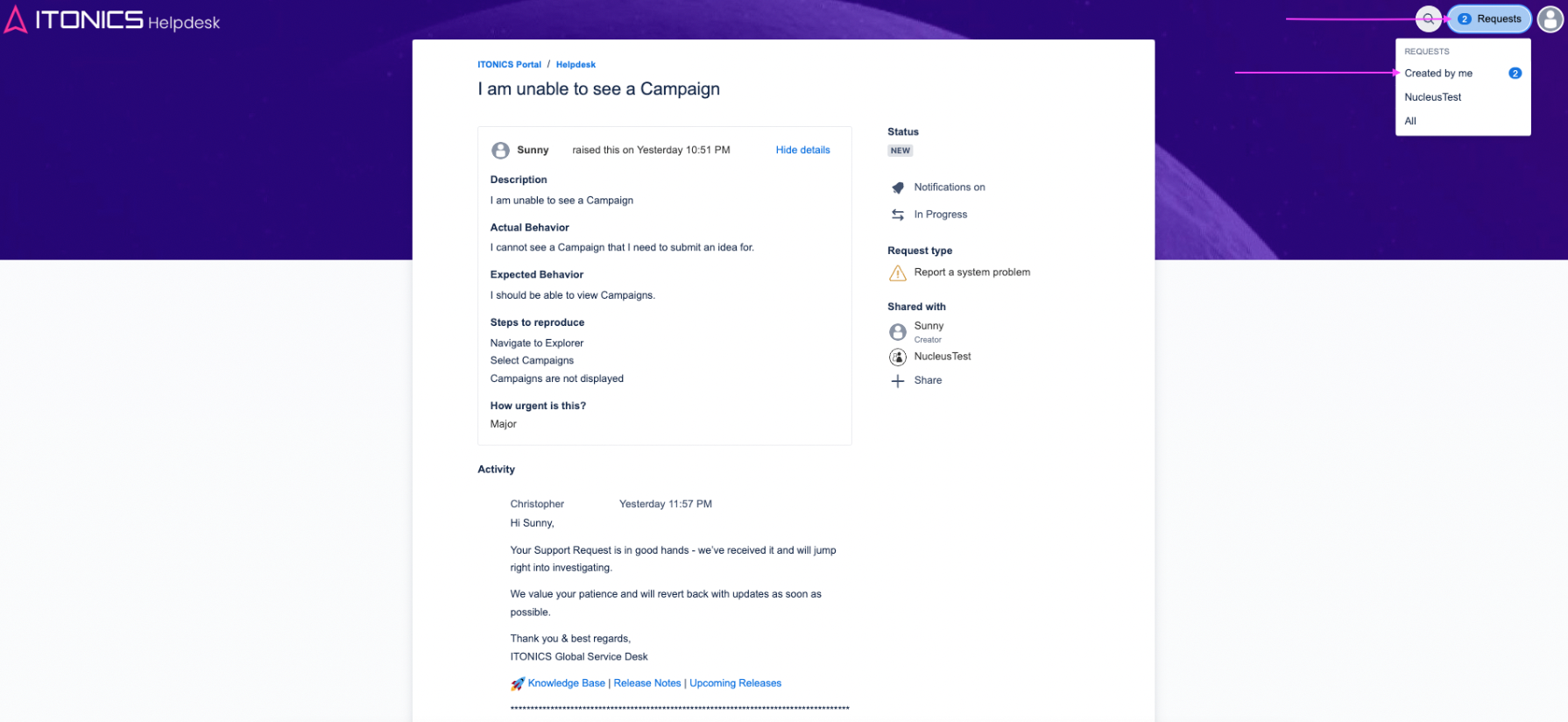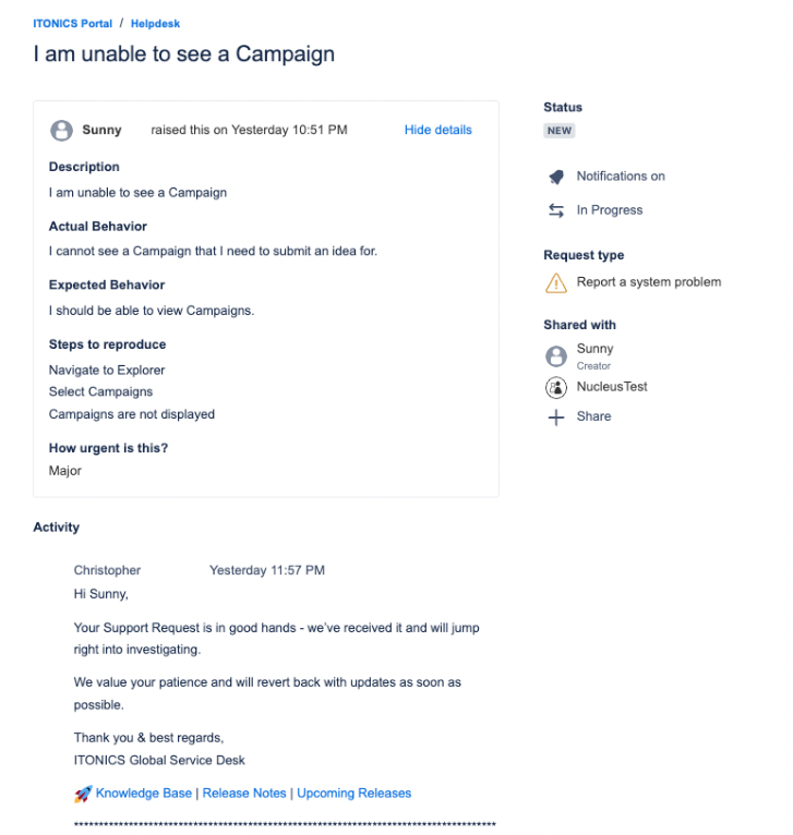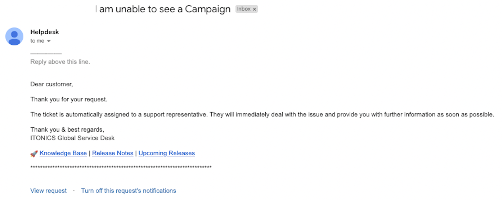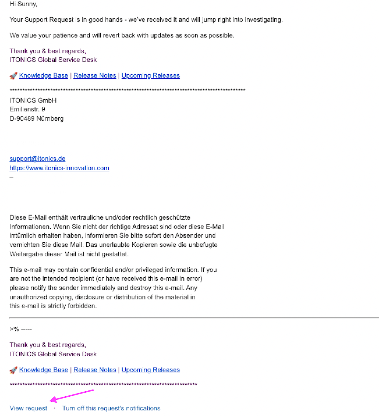 Sending the above email to support@itonics-innovation.com will create a corresponding ticket in the HelpDesk Portal which ITONICS will be notified about as indicated below.