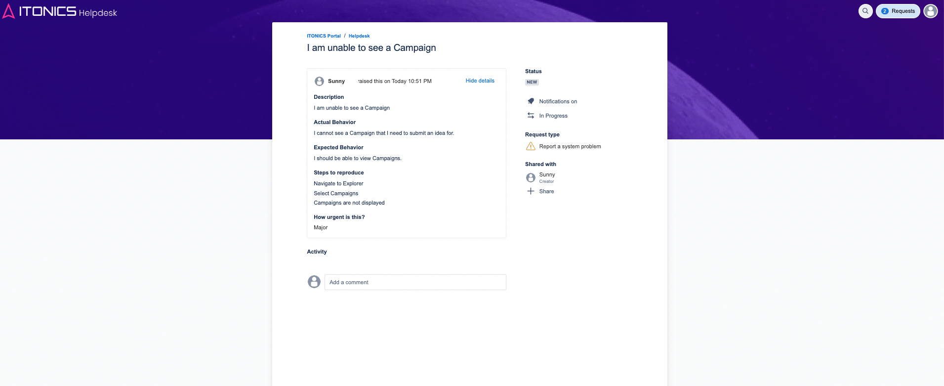 The Helpdesk Portal will record all ITONICS Support and client communication: Below is an extract of the how it is reflected in the Helpdesk Portal.