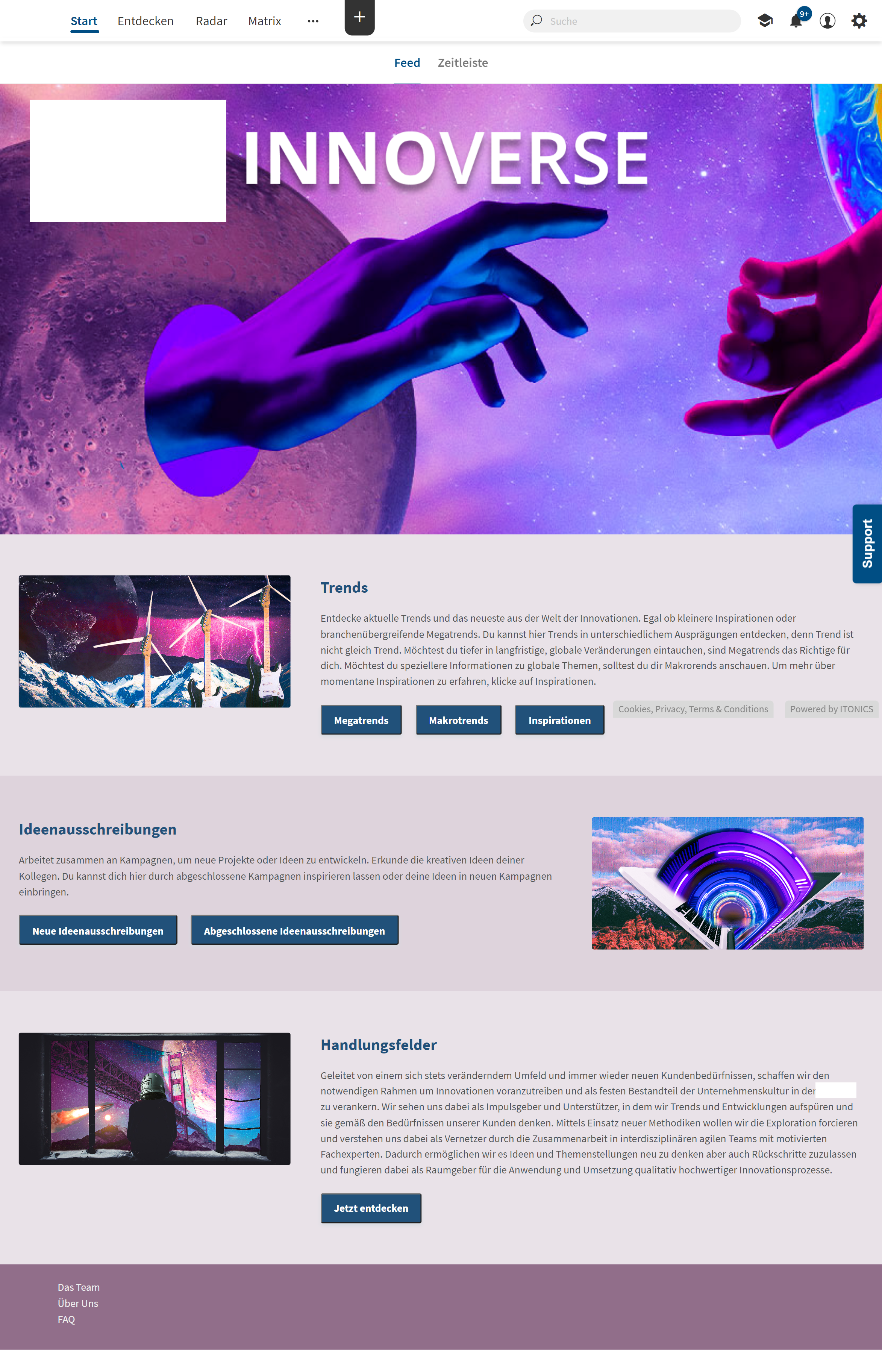 The Innoverse system aims to bridge strategy and execution. The system covers a database with daily updated information on macro-trends, micro-trends, and inspirations. The landing page design supports easy access to such updates with respective action buttons in the first section. The results of yearly trend evaluation rounds are further used to initiate idea campaigns. Via the second section on the landing page, the users get access to such campaigns and ideas. Furthermore, users are invited to learn more about the company’s innovation program in the third section.