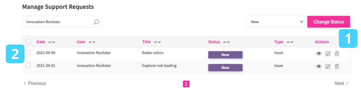 - You can Select multiple feedbacks in the checkbox on the left of each row and bulk-change their status that can be chosen in the dropdown field next to the Change Button on the upper right side. Click on the Change Status button to apply the changes (2).