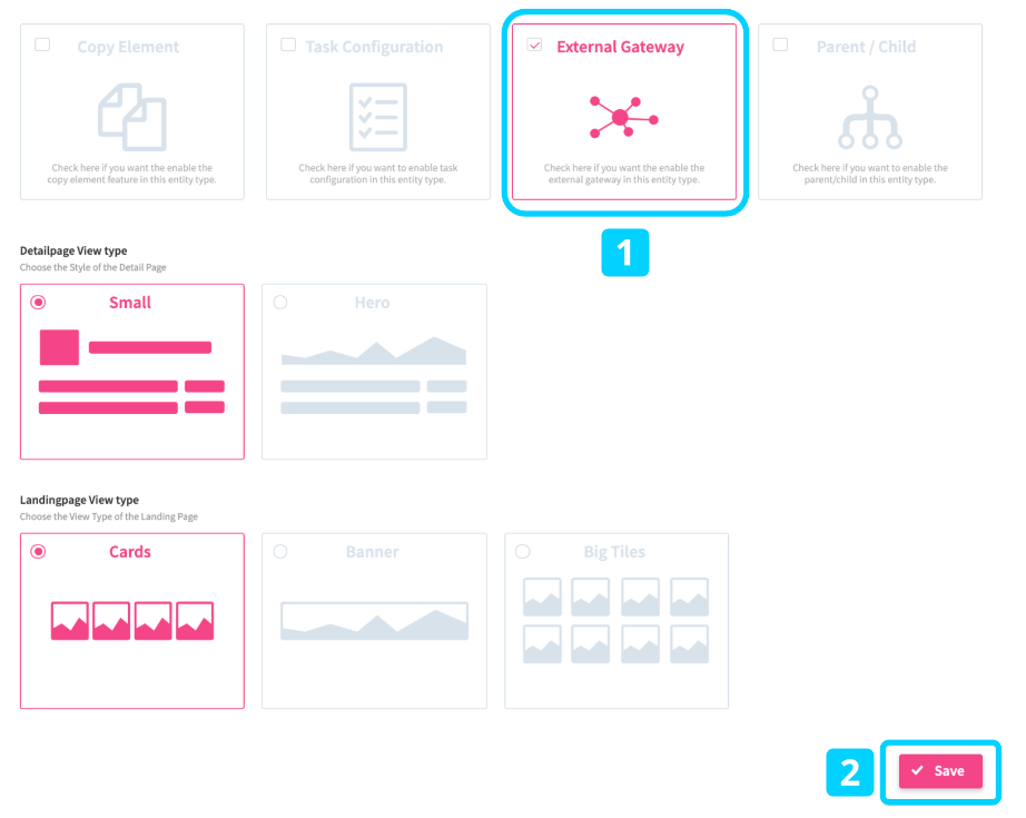 Look for the External Gateway card (1) under the Modules/Features section and check the box on the left corner of the module card. When the checkbox is marked the card should change the layout color from light gray to the system color. Don't forget to press the Save button (2) at the bottom of the page.