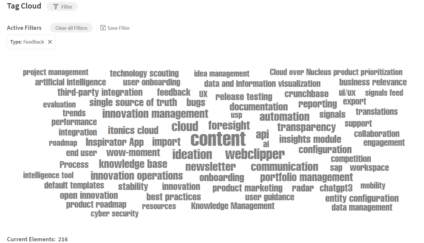 This way, you can identify easily similar topics that have been added as tags to the feedback content elements. By clicking on a tag in the tag cloud, you will also see below the tag cloud all content elements where the respective tag is used.