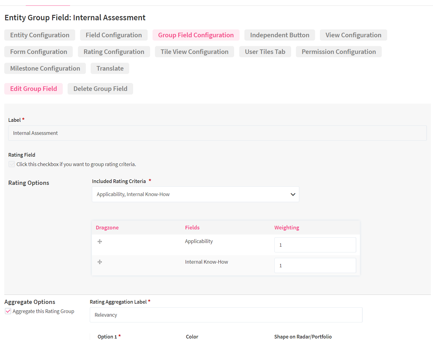 After navigating to the tab 'Group Field Configuration', you can add a new grouped rating criteria. You need to provide a name for the rating group. You need to check the box to indicate that this group field is a rating group field. Now, you will be able to select from your individual rating criteria defined, the rating criteria that should be grouped and aggregated. This can also be only one rating criterion.