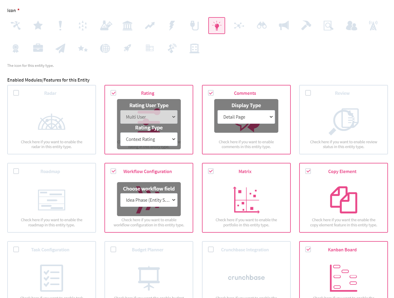Yet, in both cases, you will need to start with defining your project template. Therefore, navigate to the Settings Wheel > Entity Configuration > Entity Configuration. Use the button to add a new entity. Provide the name and select the modules that you want to activate for this entity. Please note that modules need to be activated by your Customer Innovation Success Manager first.