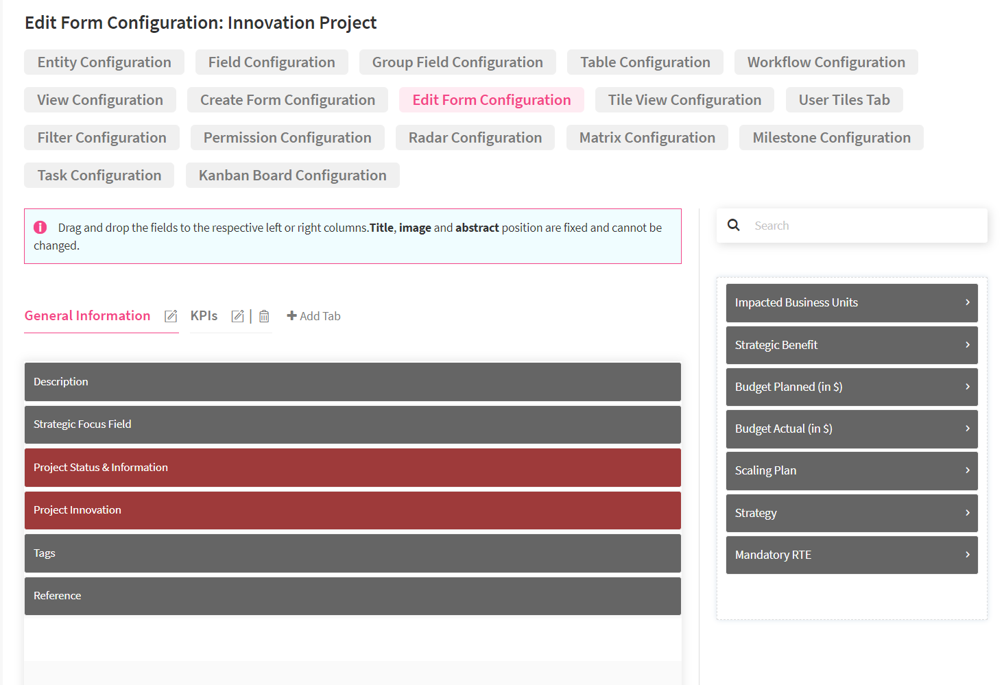 As a next step, you should navigate to the field configuration and add the necessary fields that you will need to collect the right information on all your projects in a systematic way. The following picture provides you with an example and consists of the following field attributes: