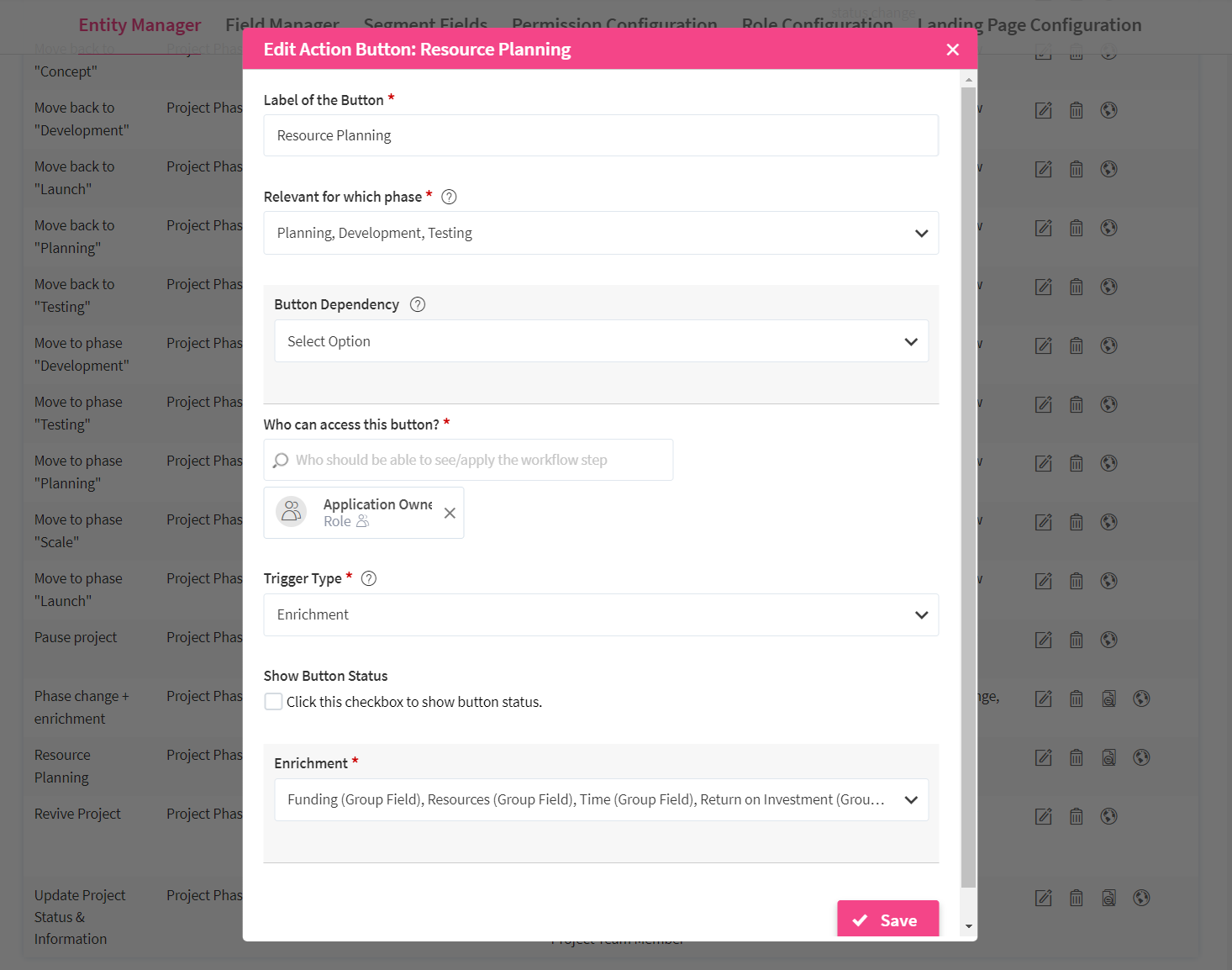 Now, a new tab is added to the entity-specific configuration page: the Workflow Configuration. From here, you can define the action buttons and trigger the actions as desired.