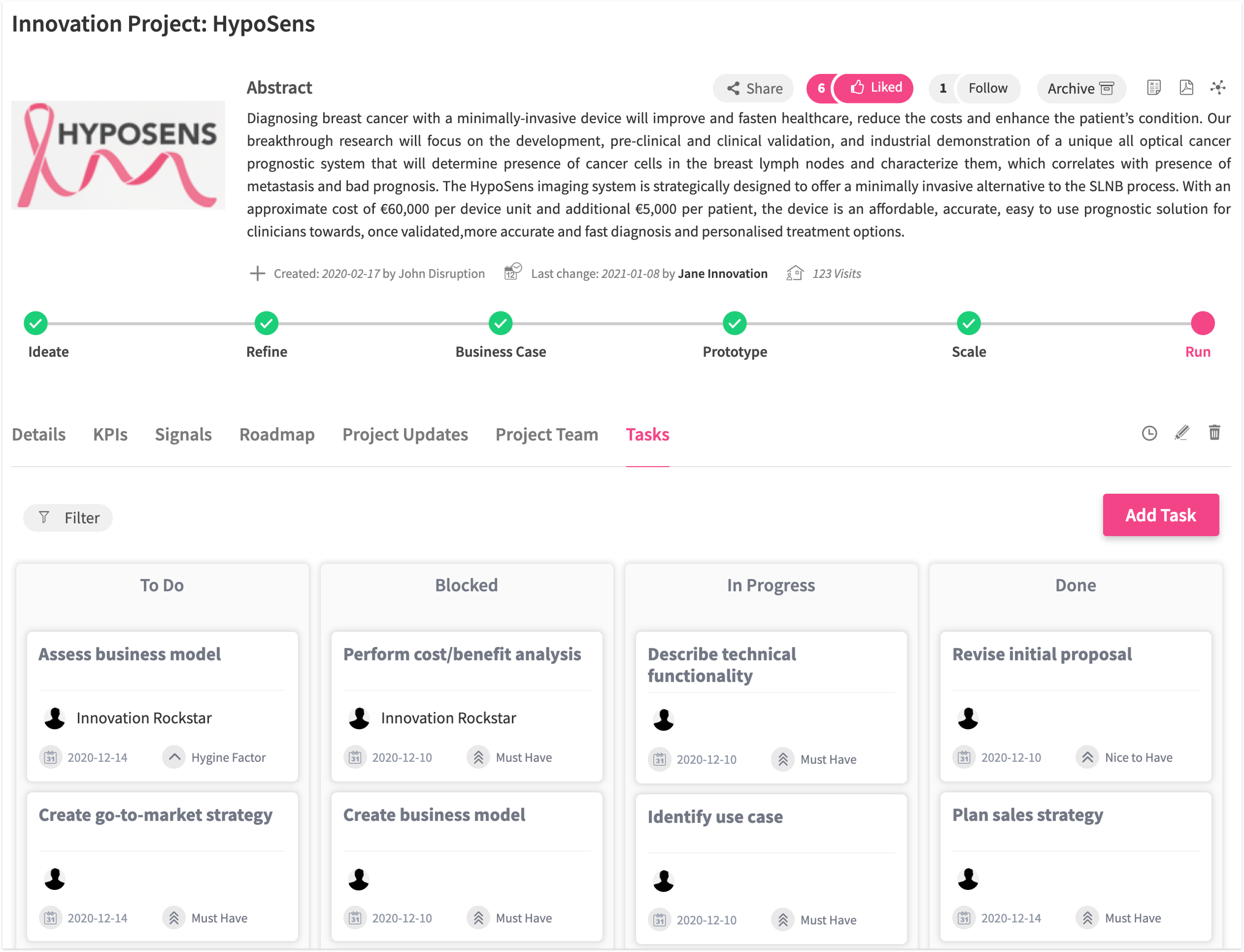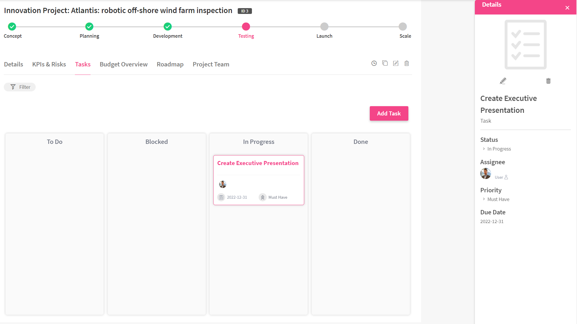 To ensure standardized quality to complete tasks along a workflow (e.g., to manage project, technology, product development), you can pre-define certain tasks required (or optional) along the different steps of the workflow. The respective tasks will be auto-created once a project/product/technology (or whatever asset you want to progress) reaches the respective stage.