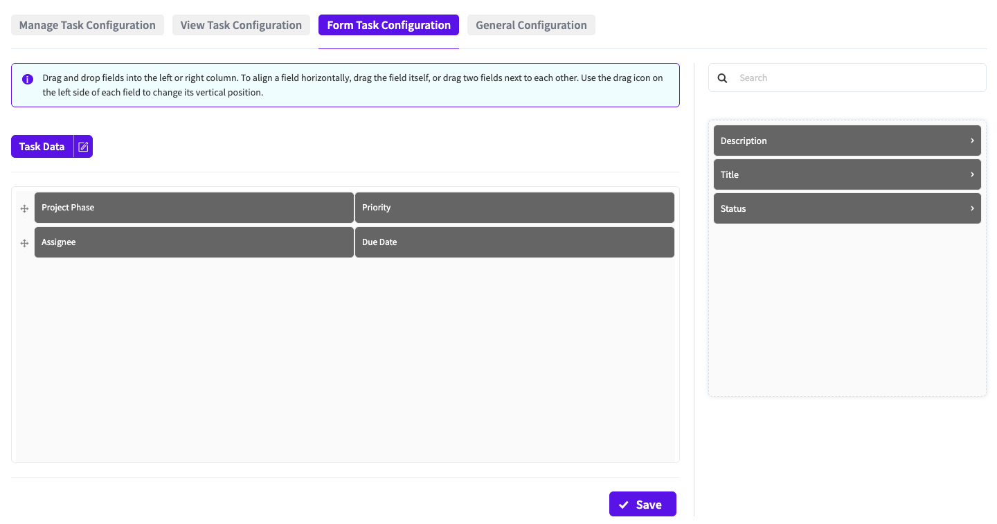 Similar to the create/edit form configuration of entity types, you can adjust the position and order of the configured fields on the create and edit form of your tasks. You can use drag and drop to place the attributes at the right position in the task form configuration. To align a field horizontally, drag the field itself, or drag two fields next to each other. Use the drag icon on the left side of each field to change its vertical position.