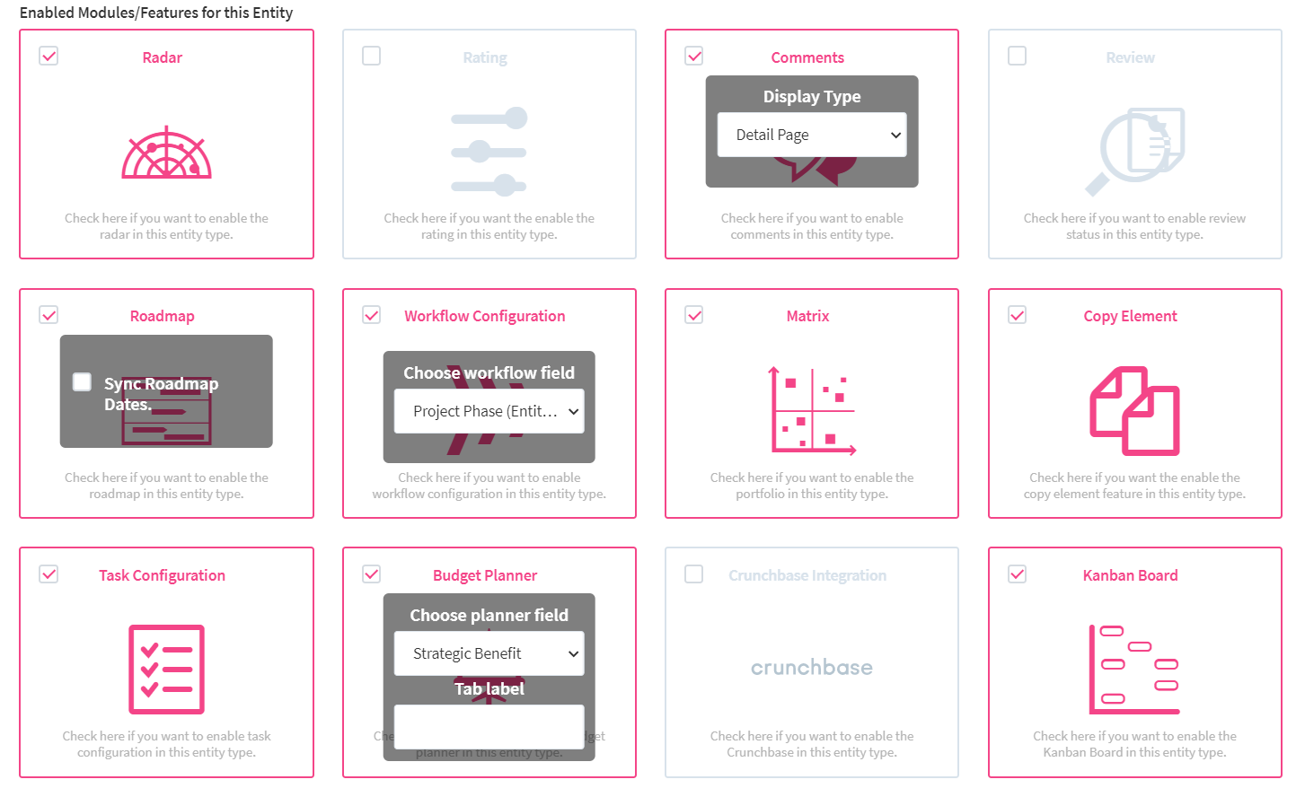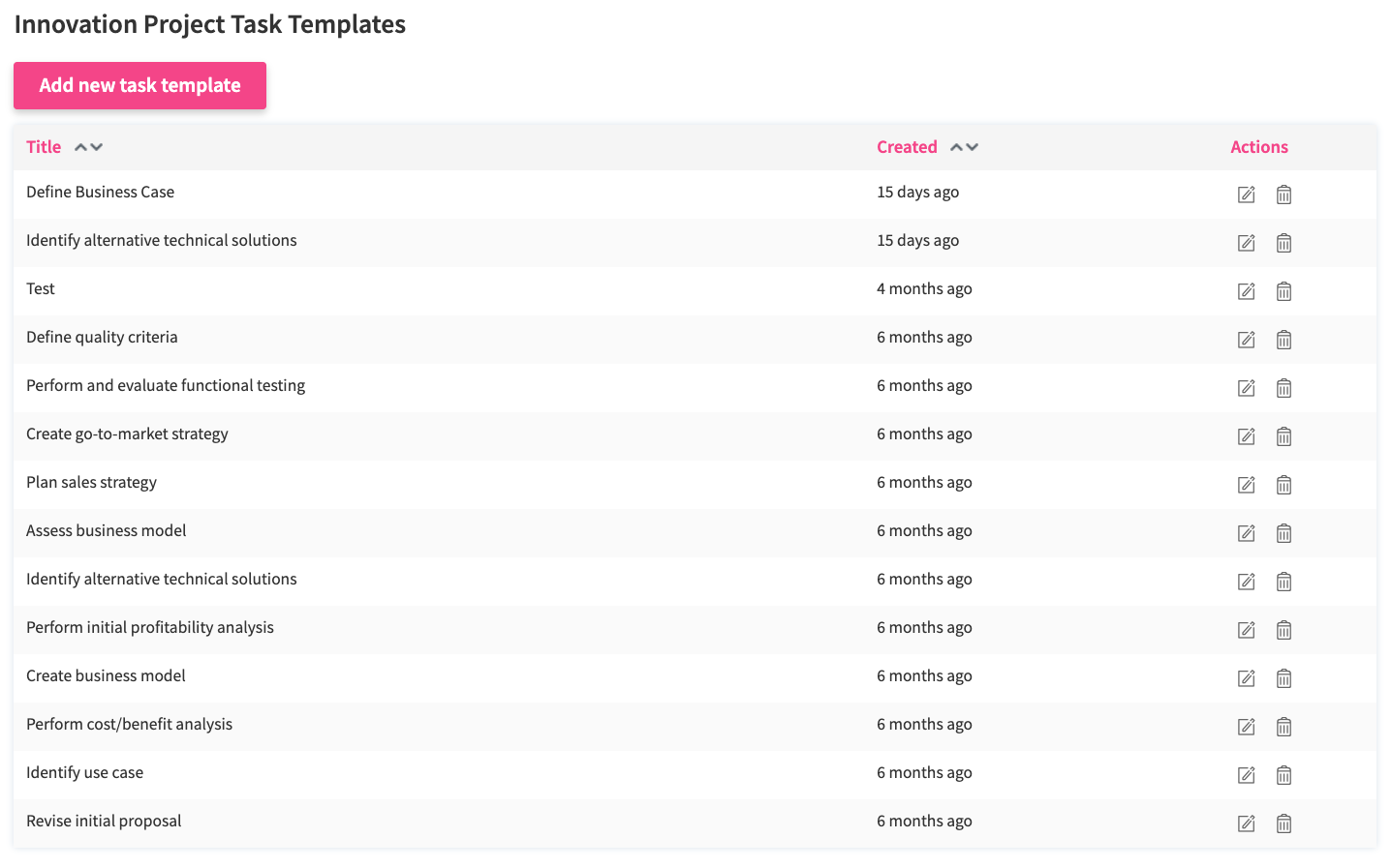 The task backlog allows you to standardize the tasks each idea or project has to deliver for different workflow steps . You can manage your task backlog via the Settings Wheel > System Administration > Task Backlog Configuration > select respective entity type. You can define different task templates for each entity type that you have enabled the task management for. Each task template consists of the following attributes, but it can be extended via the field configuration for the task object for every entity type: