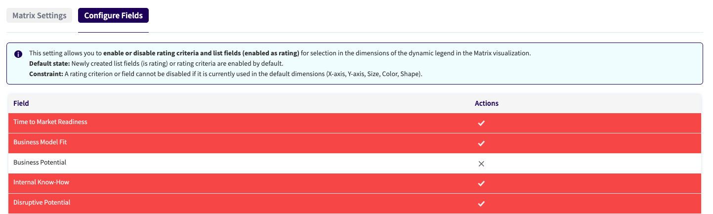 NUC-14794 - A new configuration option was implemented to define which rating and list field options are selectable in the Matrix visualization dimensions, ensuring users only see significant selection options to apply to the data.