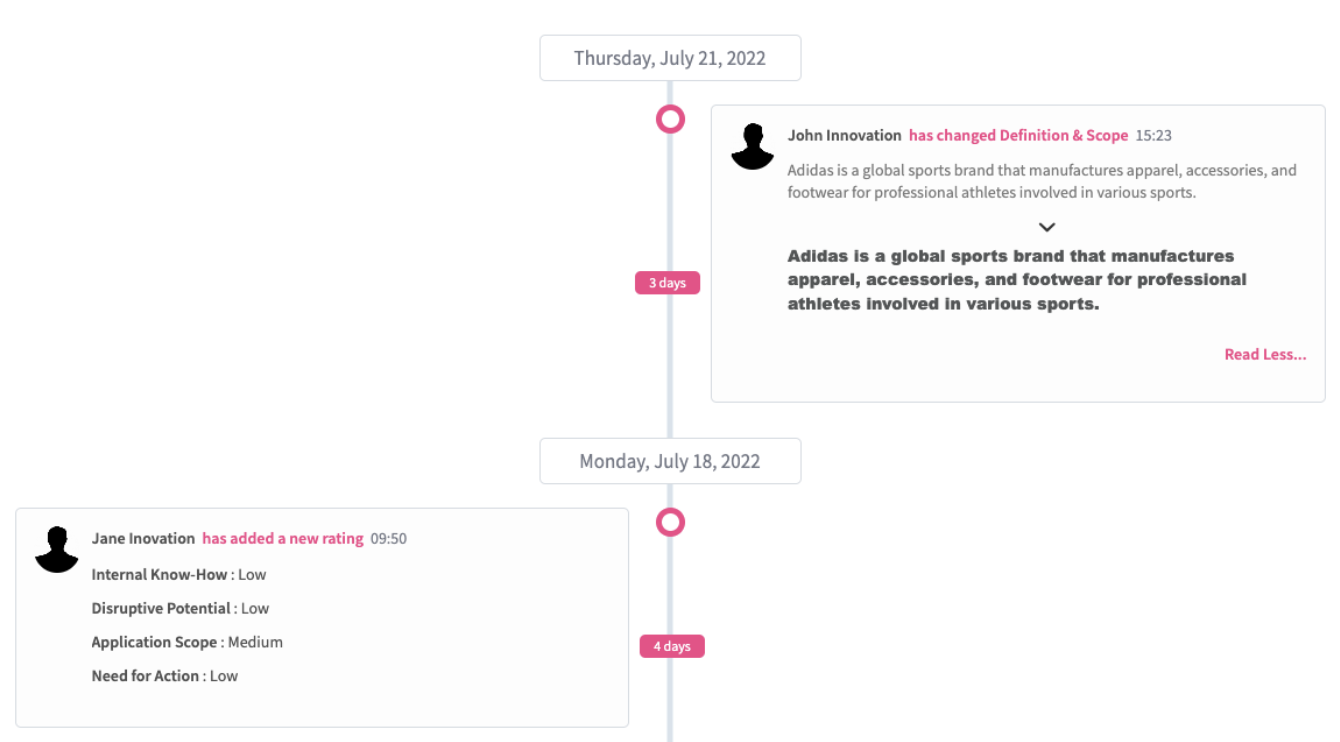 - NUC-6891 - The time between two records on the Timeline will be shown now. You can, for example, filter for "Workflow" and check how many days an Element remained in certain phases.