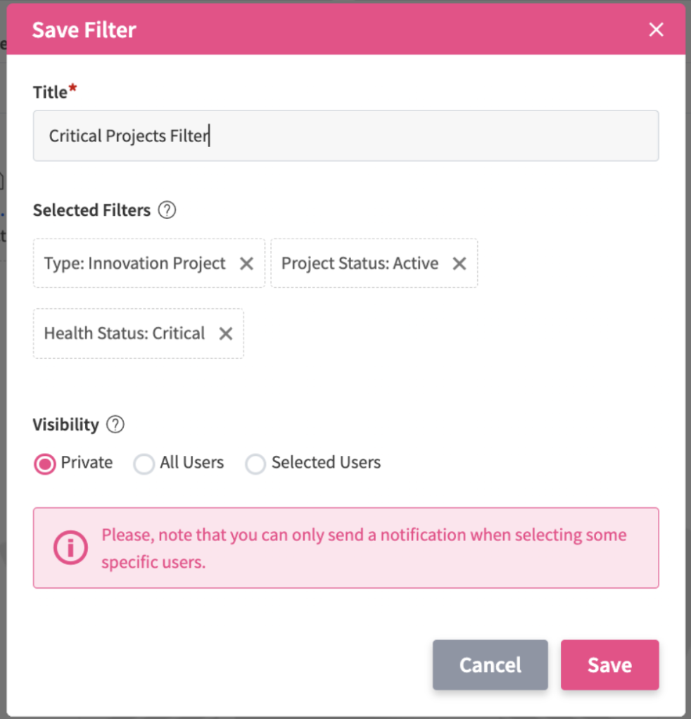 Within the Save Filter popup modal, you see an overview of the Selected Filters, where you can still unselect Filters if wanted. Now, you have the option to save a filter for your private use, share a filter with all users within the system (tied to a permission), or share a filter with only a selection of users, -groups, -roles, or contexts. Note that only for the latter option, you can choose to notify the selected users if needed.